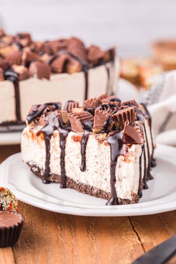 This Reese’s no-bake cheesecake layers a chocolate graham crust with peanut butter cheesecake filling and a topping of hot fudge and mini Reese’s cups. It’s rich, indulgent, and incredibly easy to make. A dream dessert for chocolate and peanut butter fans.