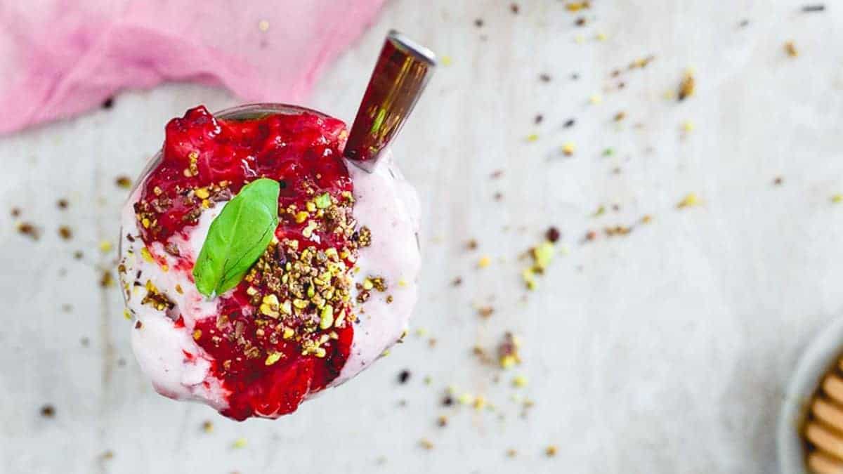 This roasted strawberry basil milkshake takes the classic favorite to a whole new level with a sophisticated twist. By roasting the strawberries, it brings out a deeper, richer sweetness that perfectly complements the fresh hint of fragrant basil. Topped with a crunchy pistachio cacao nib crumble, this milkshake adds a delightful texture and a subtle nutty bitterness that balances the creamy sweetness. It’s a grown-up treat that feels indulgent yet thoughtful, making it a healthier, more refined way to enjoy a nostalgic dessert. Perfect for anyone looking to satisfy their sweet tooth without the guilt.