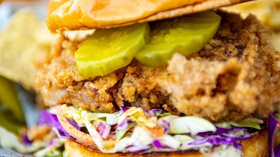 The double-dredge technique gives this chicken sandwich an unbelievably crispy and golden crust that is hard to beat. Every bite has a loud, satisfying crunch that contrasts with the juicy, tender chicken inside. We pair it with a rich and creamy ranch slaw that brings cool tang and a little freshness to the mix. Together, the textures and flavors make this sandwich feel special and seriously craveable. It easily outshines anything you would get from the big chicken chains.