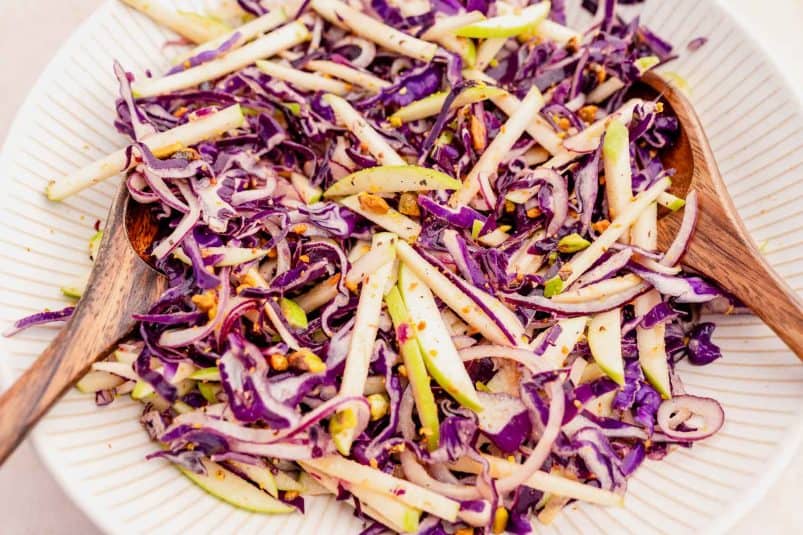 This red cabbage slaw is a refreshing twist on the classic, bursting with a satisfying crunch and vibrant flavor. Freshly shredded red cabbage is tossed with crisp apples and plump raisins, creating a delightful balance of textures and sweetness. The honey Dijon dressing ties everything together, adding a tangy yet subtly sweet finish that makes every bite irresistible. Unlike heavier, creamy slaws, this version feels light and lively, making it the perfect companion for grilled meats, roasted chicken, or even delicate fish dishes. It’s a simple yet elegant side that brightens any plate with color and flavor.