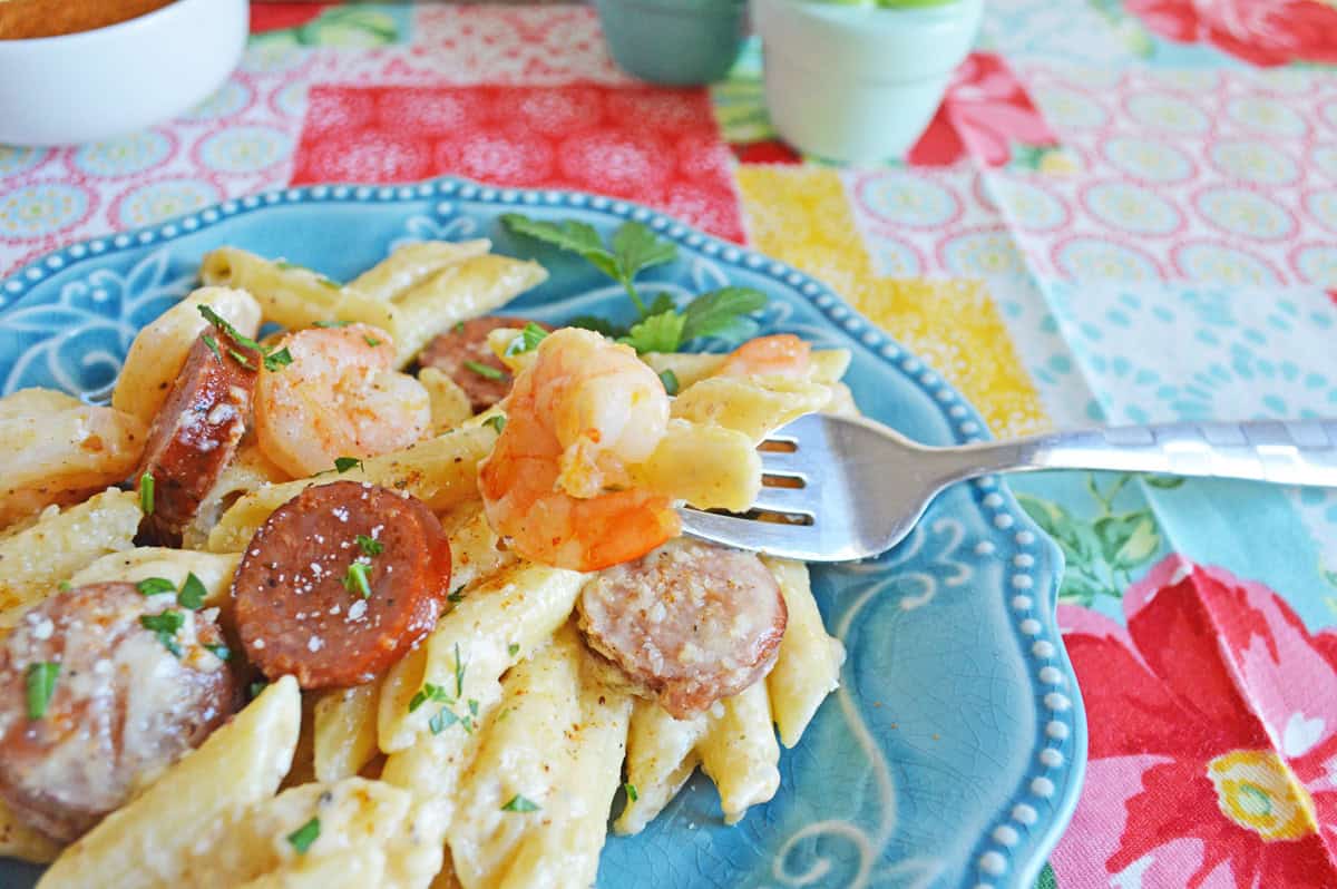 My Cajun alfredo is made with tender shrimp, flavorful sausage, and a spicy cream sauce. It tastes like something you would order at a restaurant. The best part is it is ready in about 30 minutes.