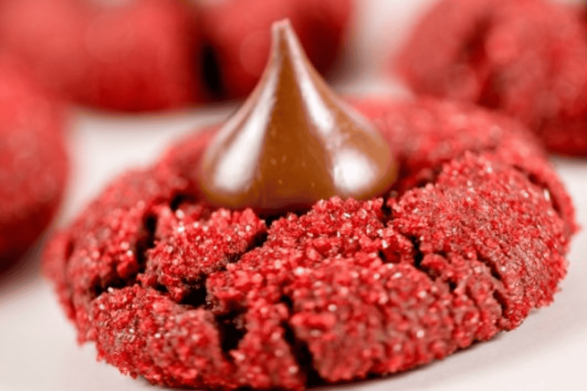 Chewy Red Velvet Cookies topped with a Hershey's Kiss: Your Favorite Christmas Cookie, all dressed up for Valentine's Day.