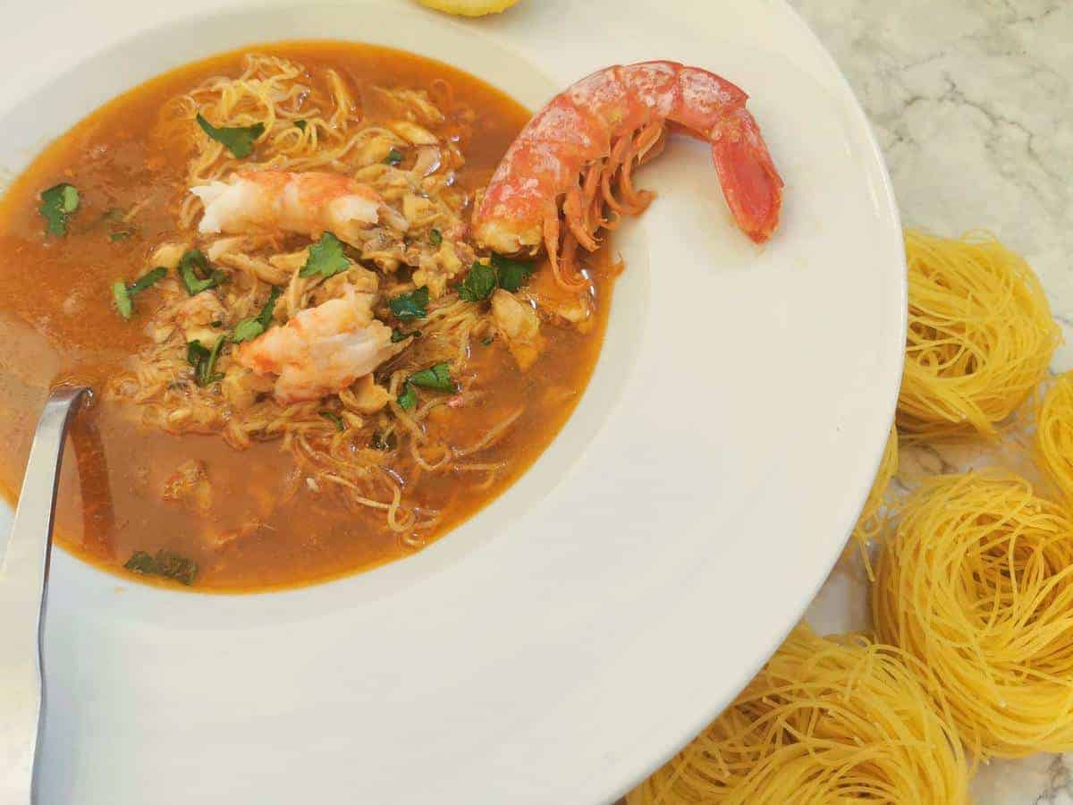 This Italian fish soup with angel hair pasta is a wonderful twist on the traditional Ligurian ciuppin, a coastal classic celebrated for its light, delicate flavors. Instead of the usual bread accompaniment, this version features crispy fried angel hair pasta, which adds a fun crunch that pairs beautifully with the tender, flaky seafood. The broth itself is rich and layered, infused with the earthy depth of dried porcini mushrooms and a gentle warmth from saffron, making each spoonful comforting yet sophisticated. Topped with sautéed prawns and finished with a bright sprinkle of fresh parsley and a squeeze of lemon juice, every bite is a perfect harmony of textures and flavors. It’s the kind of dish that feels special enough for a celebration, yet comforting enough for a cozy night in.