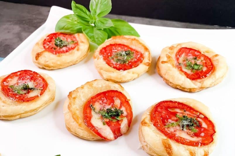 Each circle of buttery puff pastry is baked until golden and crisp, creating the perfect base for a layer of gooey melted mozzarella cheese. A slice of fresh garden tomato rests on top, adding a burst of sweetness and color that balances the richness of the cheese. The combination of flaky pastry, creamy cheese, and juicy tomato feels both comforting and elegant, ideal for any occasion. These little bites are simple to make yet deliver a satisfying blend of textures and flavors that everyone will love.