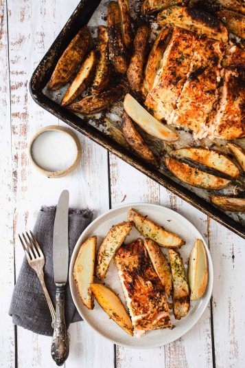 This baked salmon with creamy garlic sauce and tender potatoes is the ultimate weeknight sheet pan meal. In just 30 minutes, you get perfectly cooked salmon topped with a rich, velvety sauce that’s packed with flavor. The potatoes roast alongside the fish, soaking up some of the sauce and becoming soft and flavorful. It’s a simple, fuss-free dinner that feels special enough for guests but easy enough for a busy evening. Every bite is comforting, savory, and utterly satisfying, making it a meal the whole family will love.