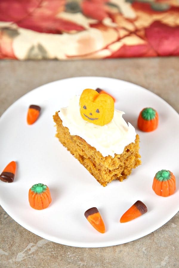 Moist lightly spiced pumpkin bars topped with a generous helping of cream cheese frosting. These taste like Fall and are perfect for Thanksgiving dessert.