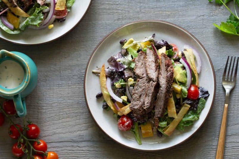 This vibrant Southwest salad is bursting with bold flavors and colorful ingredients, making it a refreshing yet hearty dish. It’s packed with crisp veggies and tossed in a tangy, zesty dressing that adds the perfect kick to every bite. Whether you're craving something fresh or looking to switch up your weeknight dinner, this salad hits the spot. Add slices of juicy grilled steak on top to turn it into a satisfying, protein-packed meal that feels both wholesome and indulgent.