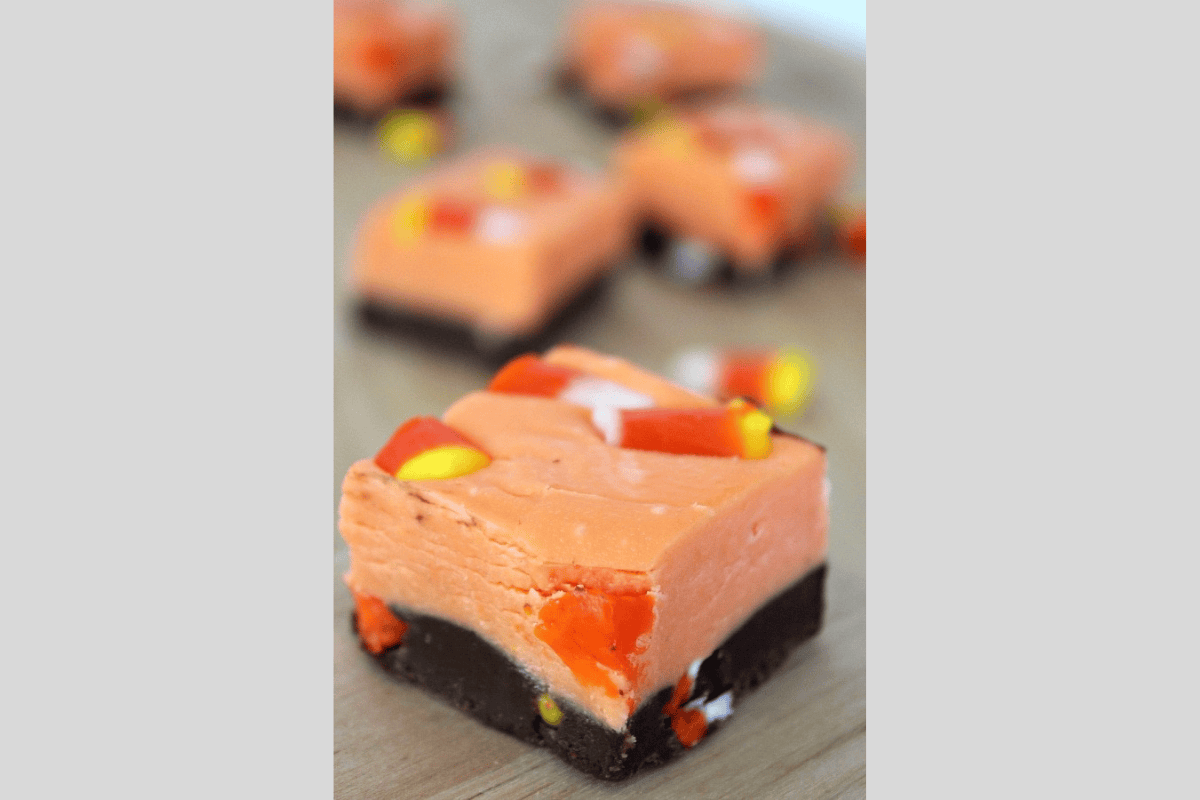 Two delicious layers of rich chocolate fudge topped with candy corn.