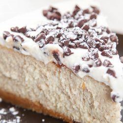 - Evenly spread whipped cream over cheesecake. Top with mini chocolate chips and powdered sugar if desired.