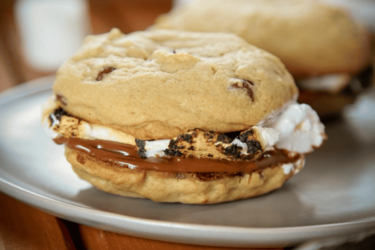 Chocolate Chip Cookie Smores: Gooey marshmallow and creamy chocolate sandwiched between two chewy chocolate chip cookies.