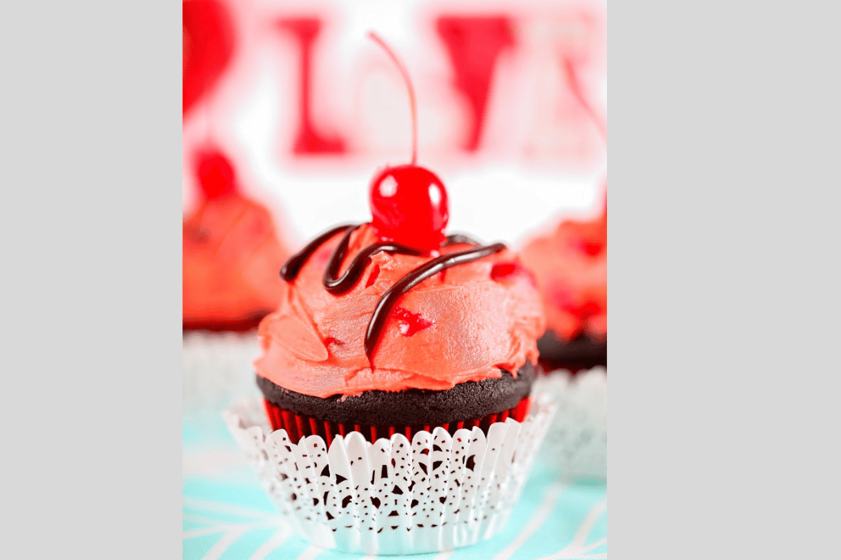 Moist chocolate cupcakes topped with a sweet cherry buttercream and rich chocolate ganache.