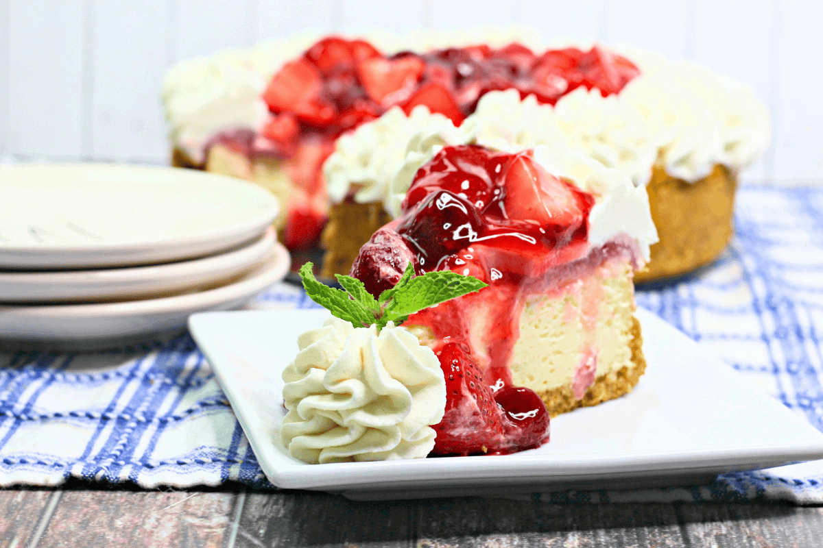This rich and creamy cheesecake is topped with a sweet strawberry sauce. Sink your teeth into this decadent and EASY recipe. Get the recipe: Strawberry Cheesecake