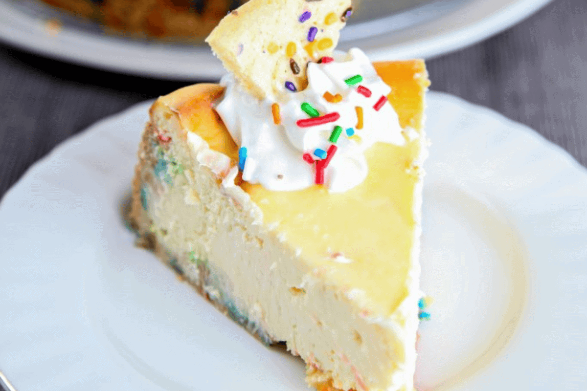 Creamy cake batter cheesecake nestled inside a sugar cookie crust. Topped off with whipped cream and birthday cake cookies. A birthday cake addict's dream come true! Get the recipe: Cake Batter Cheesecake