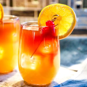 - Pour into glass and top with dark rum. Garnish with orange slices and cherries if desired.