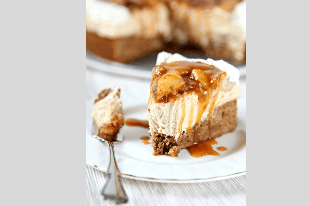 Creamy caramel cheesecake inside a Cinnamon blondie crust topped with cinnamon apples and a decadent caramel drizzle.