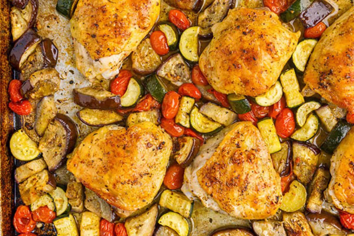 This budget friendly dinner uses cheap chicken thighs and a blend of veggies to make a one dish meal that the whole family will enjoy. Serve with bread on the side for an easy tray bake dinner.
