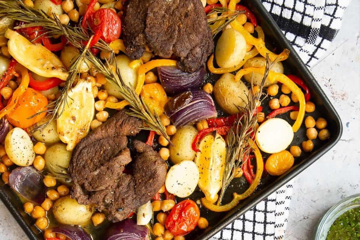 This tray bake meal uses juicy lamb steaks and a great assortment of potatoes, onions, peppers and chickpeas to make a one dish meal that is restaurant quality, right from your home kitchen. You will love how easy this is to bake and clean up.Get the recipe: Lamb steak tray bake