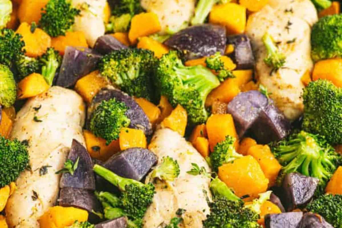 This chicken tray bake is loaded with broccoli, butternut squash, and potatoes for a filling family meal that is easy to prepare. With maple dijon flavor in each bite, you will want to keep this recipe for future easy dinners on busy weeknights.