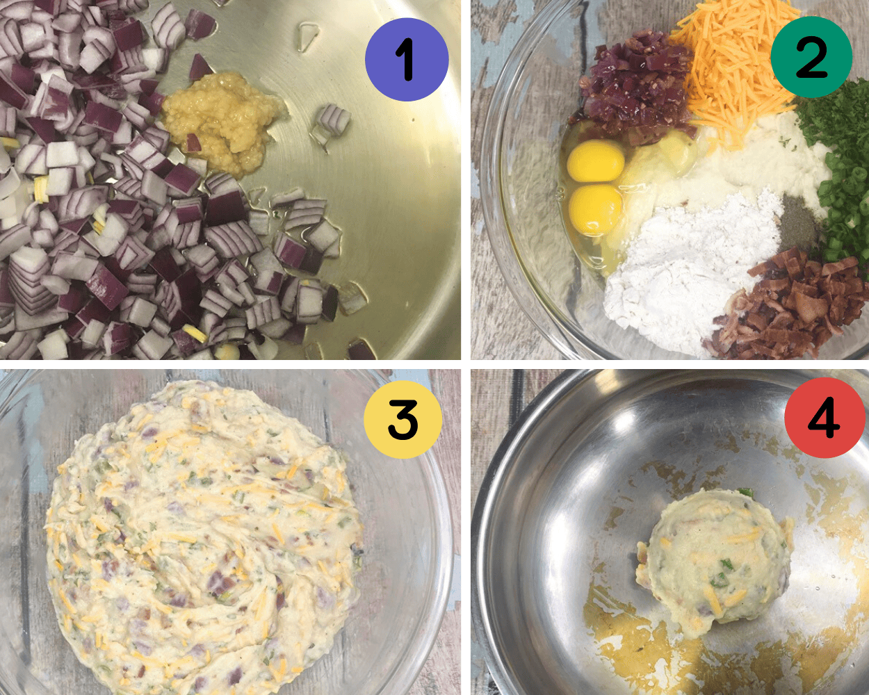 - In a large bowl, combine mashed potatoes, cheese, eggs, flour, bacon, onion ,garlic, salt, pepper and parsley.