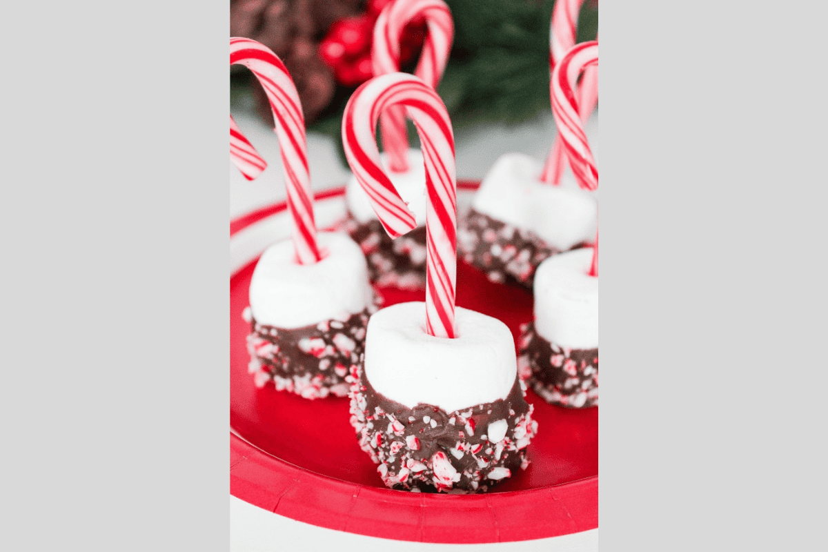 - Dip each marshmallow into the melted chocolate. Sprinkle with crushed candy canes.