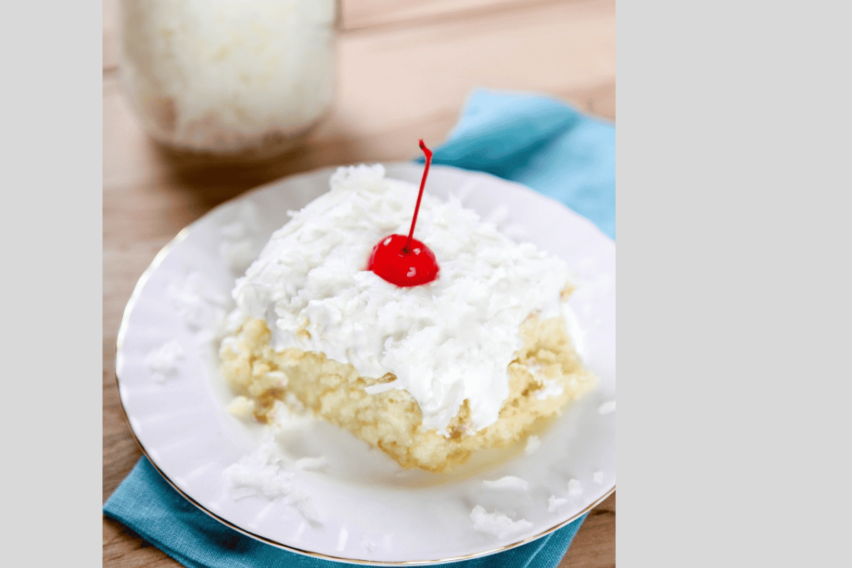 - Sweetened Shredded Coconut and Maraschino Cherries To Garnish