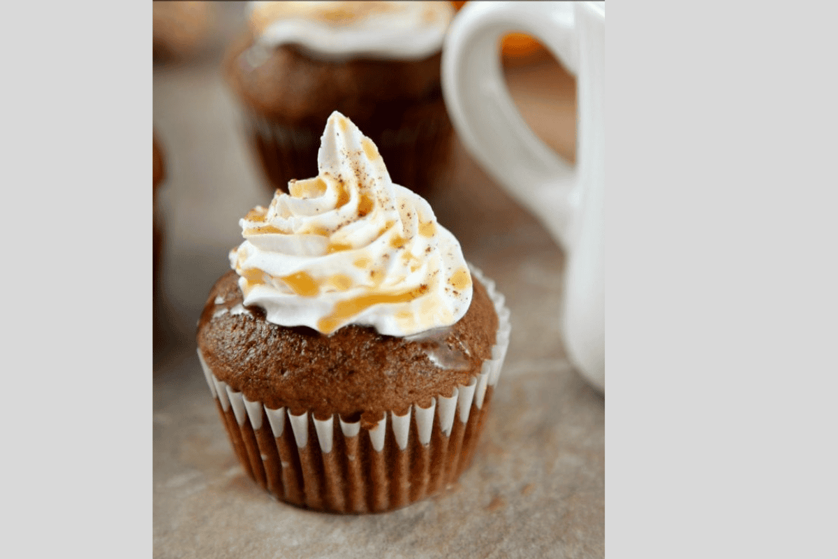 Moist pumpkin spice cupcakes topped with whipped cream and a decadent drizzle.