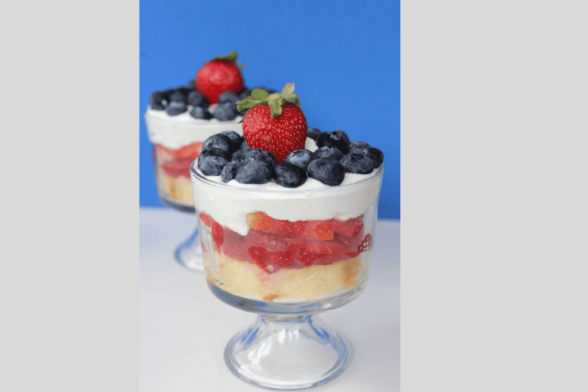 My solution are these individual red, white, and blue strawberry trifles. Don't feel that you have to buy mini trifle dishes. Mason jars or even disposable clear plastic cups would do just fine for this strawberry trifle as well!