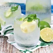 Top with club soda if desired, and garnish with lime wedges and mint.