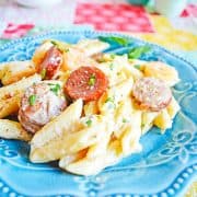 My Cajun alfredo is made with tender shrimp, flavorful sausage, and a spicy cream sauce. This easy 30 minute meal tastes like something you splurged on at a restaurant.
