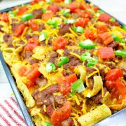 Preheat the oven to 350 degrees F. Line a 9x13 inch pan with nonstick foil and spray with cooking spray. Add around half of the corn chips to the bottom of the pan and top with around 1 cup of cheese.
