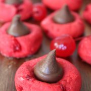 Cherry shortbread cookies with a Hershey's kiss in the center. Looks gorgeous on holiday cookie trays.