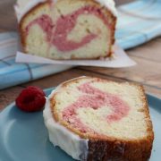 Buttery pound cake swirled with raspberries, and topped with a sweet glaze.